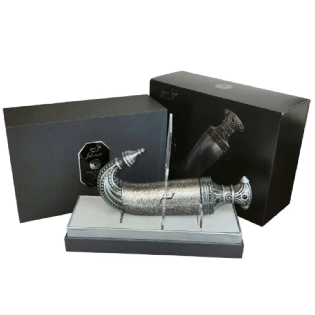 اولین چیزی که در مورد ادکلن لطافه خنجر جلب توجه میکنه، بدون شک بطری خاص و متفاوتشه. همونطور که از اسمش پیداست (“خنجر”)، بطری این عطر به شکل یک خنجر سنتی عربی (شبیه خنجر عمانی) طراحی شده. بدنهای فلزی و براق (معمولاً نقرهای یا طلایی) با جزئیات حکاکی شده و گاهی نگینهای کوچک تزئینی، ظاهری بسیار لوکس و کلکسیونی بهش داده. این بطری فقط یه ظرف نیست، بلکه نمادی از قدرت، سنت و هنر شرقیه و به تنهایی میتونه یه دکوری جذاب روی میز آرایش شما باشه. جعبه محکم و زیبای اون هم حس لوکس بودن رو تکمیل میکنه.